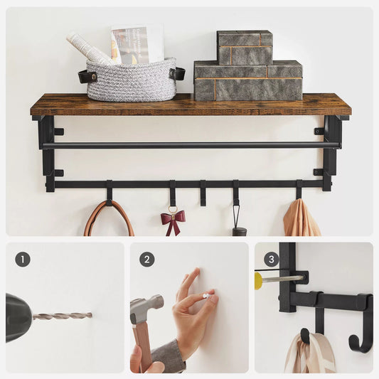 In And OutdoorMatch Wall Coat Rack Sincere - with Shelf - Wall Shelf - with 10 Removable Hooks - Hanging Shelf - Wall Mounted - 2 Coat Racks - Clothes Rail - for Hall - Bedroom - Bathroom - Vintage Brown/Black