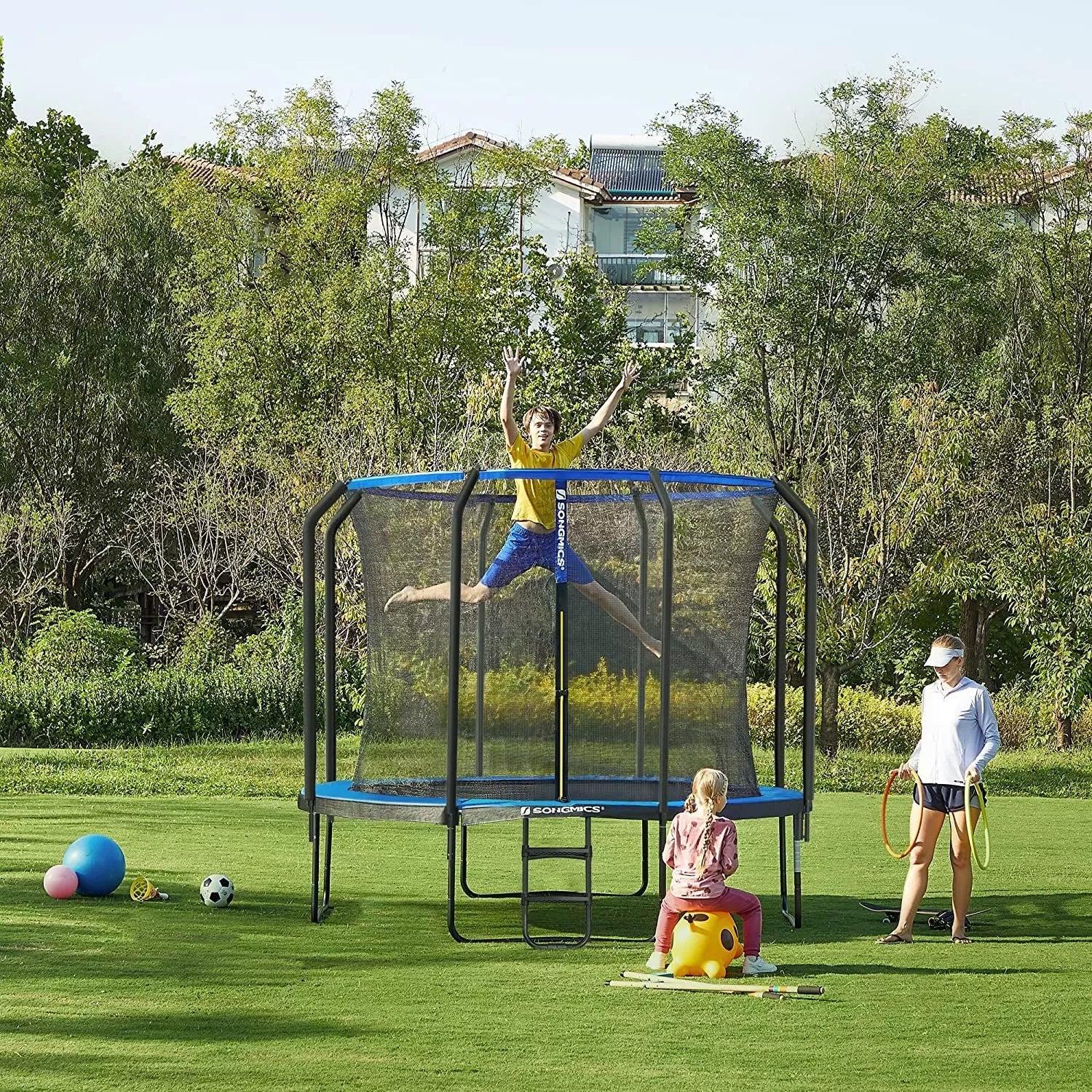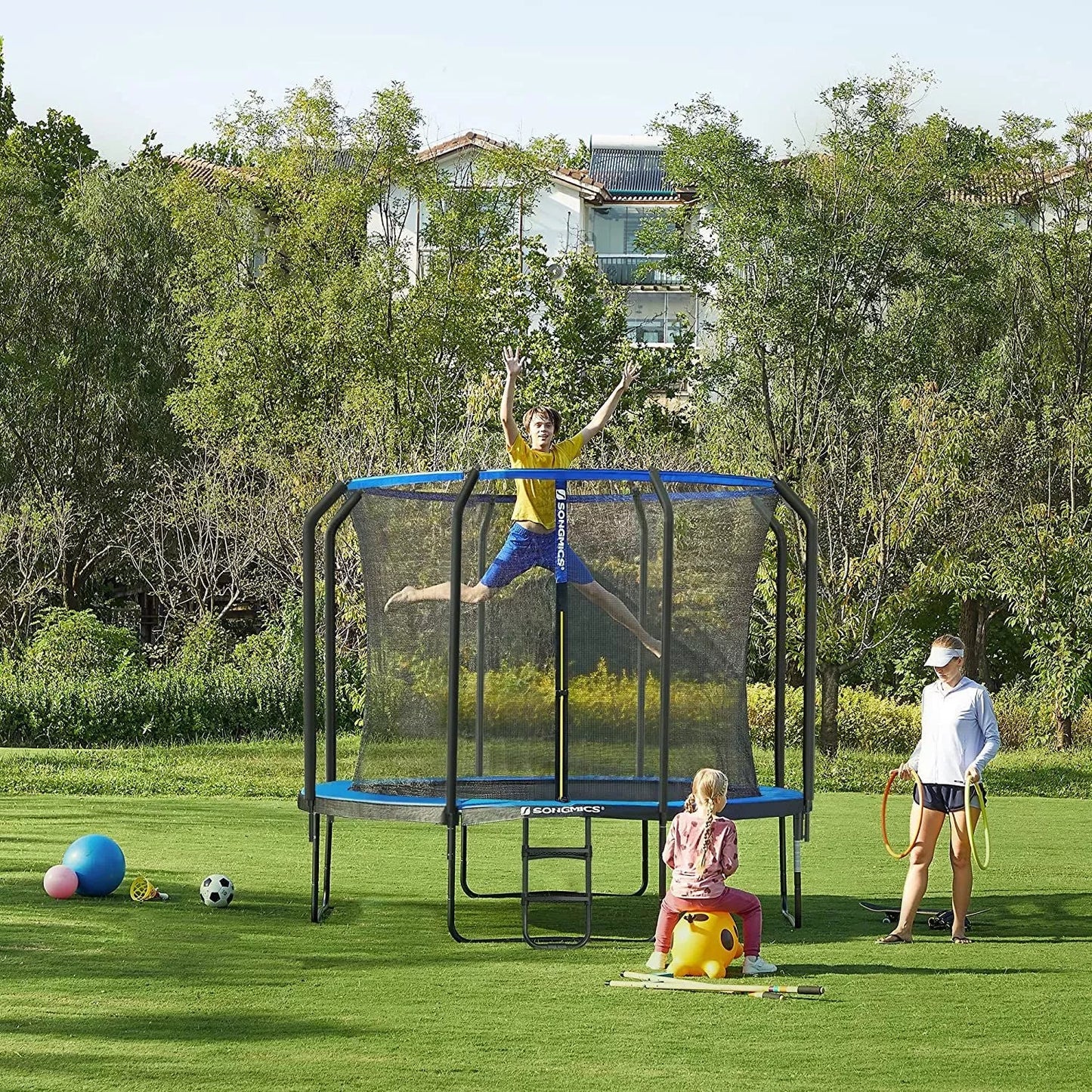 Fun in the garden: This trampoline from Inand Outdoormatch offers both you and your family a 1A jumping experience. Because safety is our priority, the galvanized and powder-coated frame is stable and rust-resistant. The 4 W-shaped legs keep the jumping mat in balance. This jumping device is of course destined as a gift for your children. But you can also try it, because the trampoline can carry up to 150 kg. Included in delivery are a jumping mat, an edge cover, a safety net, handrails and a ladder - everything you need to have fun outdoors! Product details: color: Dark blue Material: Legs, safety net edge: Galvanized, powder-coated steel Outer ring frame, T-bar connectors: Galvanized steel Springs: Zinc Ladder: PP plastic (0.9 g/cm), steel tube Jumping mat: PP plastic (265 g/m) Edge cover: PVC (310 g/m), EPE foam Safety net: PE plastic (95 g/m) Dimensions: Frame with jumping surface: 305 x 76 cm ( x H) Safety net: 180 cm (H) Ladder: 41 x 105 cm (W x H) Distance between ground and trampoline surface: 76 cm Max. static load capacity: 150 kg. Scope of delivery: 1 x trampoline 1 x ladder 1 x accessory package 1 x manual