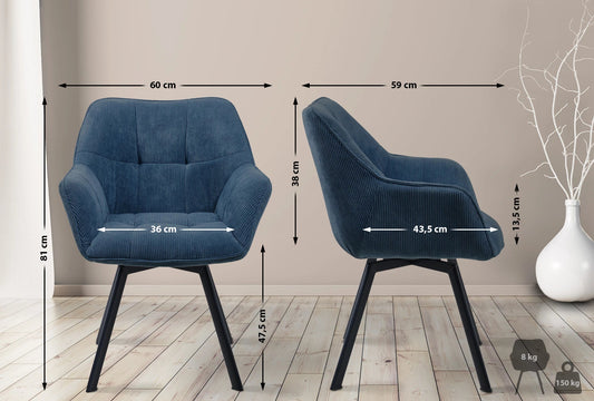 In And OutdoorMatch Eetkamerstoel Emily - Blauw - Stof - Hoge kwaliteit bekleding - Corduroy Eetkamerstoel - Stijlvolle en bijpassende look