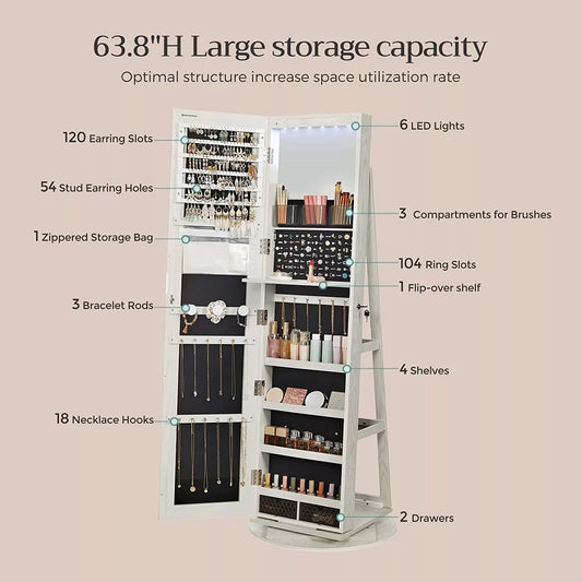 In And OutdoorMatch spiegelkast Ayden - sieradenkastje met spiegel - binnenverlichting - met frameloze passpiegel - 3 planken, 360 draaibaar, afsluitbaar, wit met houtnerf